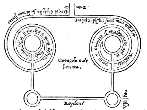 Wie man einem jungen oder auch älteren Pferd die Caragolo oder Lumaca lehrt und was damit erreichen kann.Nachdem du wie zuvor beschrieben dein junges Pferd auf den Ringen gearbeitet hast, und es dort sicher trabt, solltest du ihm einen Zaum mit einem einfachen Hohlgebiss anlegen, das für sein Maul und seine Statur passend gemacht ist. Reite es damit zunächst zwanzig Tage. Gehe dann mit ihm sanft und zwanglos zuerst im Schritt, dann im Trab auf einem großen Zirkel und verkleinere diesen nach und nach bis auf die Größe von einer Rute (ca. 1,2m), wechsle dann die Hand und erweitere den Zirkel bis zu der Größe, mit der du begonnen hast. Dann reite gerade auf derselben Hand in die andere Schnecke. Verkleinere sie auf dieselbe Weise, wie du es in der anderen getan hast. Wechsle dann wieder die Hand, erweitere die Schnecke wieder und reite in die andere Schnecke. Fahre so fort bis es dir genug scheint. Dann sollst du (nachdem du dein Pferd zunächst in der Mitte der Schnecke ein wenig stehen gelassen hast) geradeaus weiter reiten und in dem kleinen Ring durchparieren. Reite dann zwei oder drei kleine Volten um dein Pferde auf der Seite zu biegen, die dir am sinnvollsten erscheint. Reite dann im Schritt mehrmals auf der geraden Linie, die du auf der Zeichnung siehst, bis zu dem anderen kleinen Zirkel. Sollte dein Pferd dabei von sich aus versuchen zu halten, reite noch zwei Schritte weiter und wende erst dann. Danach reite im Trab von dem einen kleinen Zirkel zum anderen und wende dort jeweils. Ebenso wie du im Schritt solltest du dies acht oder zehn Mal im Trab wiederholen. W du an das Ende der Bahn zu einem der kleinen Zirkel kommst pariere aus dem Trab durch, reite dann sofort noch eine halbe Reitbahnlänge und beendet die Arbeit auf der Hand, die dir am sinvollsten erscheint, pariere dort sanft durch und steige sofort ab. Diese Art von Lektionen, die für jedes Pferd geeignet ist, nenne ich Caragolo oder auch Lumaca ( beides bedeutet Schnecke ), weil sie an deren Form erinnert. Führe dein Pferd dann vom Reitplatz weg. Aber um diese Lektionsfolge besser zu verstehen betrachte die beigefügte Zeichnung. |
